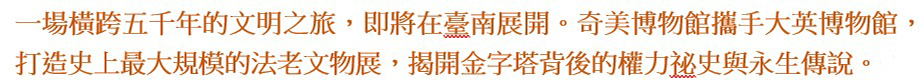 奇美博物館表示,《埃及之王:法老》是館方第四度與大英博物館合作的大型國際展覽。大英博物館為全球最具影響力的文化殿堂之一,擁有逾 800 萬件典藏,其中古埃及與蘇丹文物高達 10 萬件,規模僅次於埃及本土博物館。