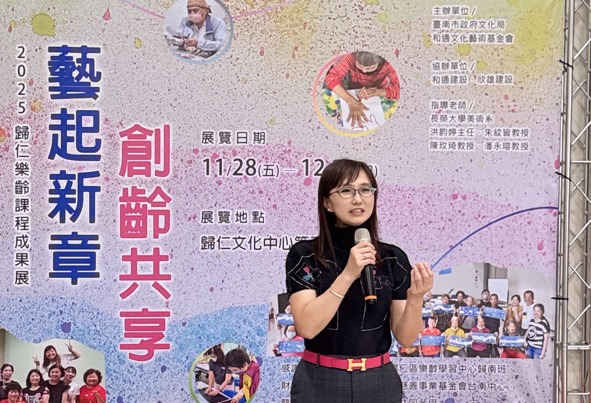 臺南市政府文化局專委方敏華表示,很高興能夠持續與和通文化藝術基金會合作推動樂齡課程,從第一屆「藝向樂齡 歸仁藝象」到今年展覽,作品品質逐年提升,許多作品甚至具備專業展覽水準,令人驚豔。她特別感謝基金會董事長李怡寧的支持,以及長榮大學美術系洪韵婷主任、朱紋皆教授、陳玫琦教授與潘永瑢教授的投入,使課程更臻成熟,並成功深入偏鄉社區,讓更多長者受惠。