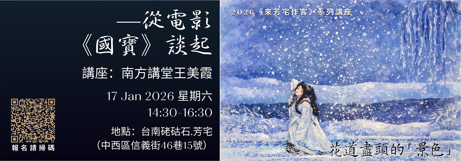系列首場講座將於2026年1月17日(星期六)下午2時30分於台南硓咕石.芳宅登場,以近年日本影壇與文化界高度關注的電影《國寶》為題,主題為「花道盡頭的『景色』——從電影《國寶》談起」,由南方講堂講師王美霞擔任主講。