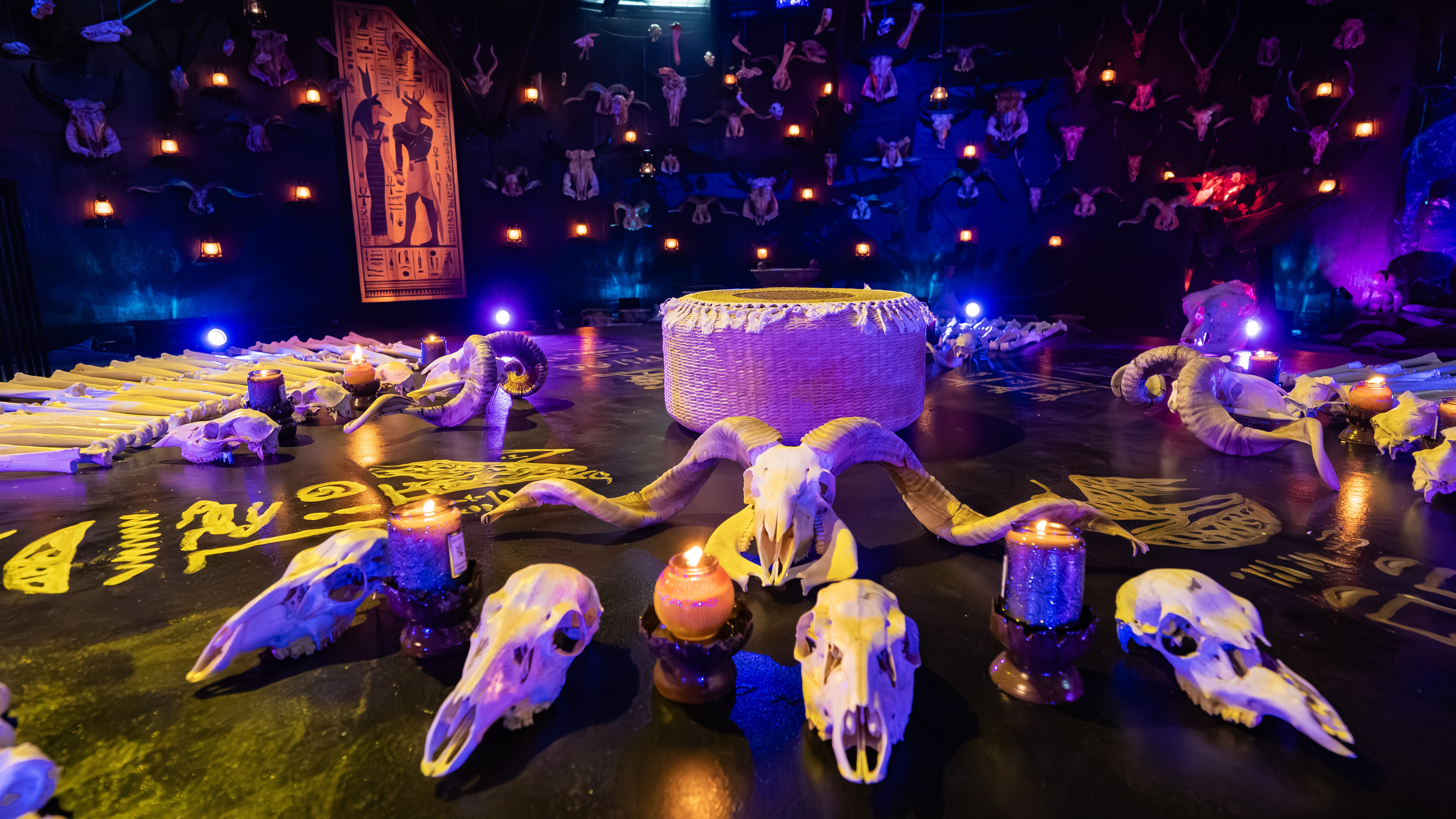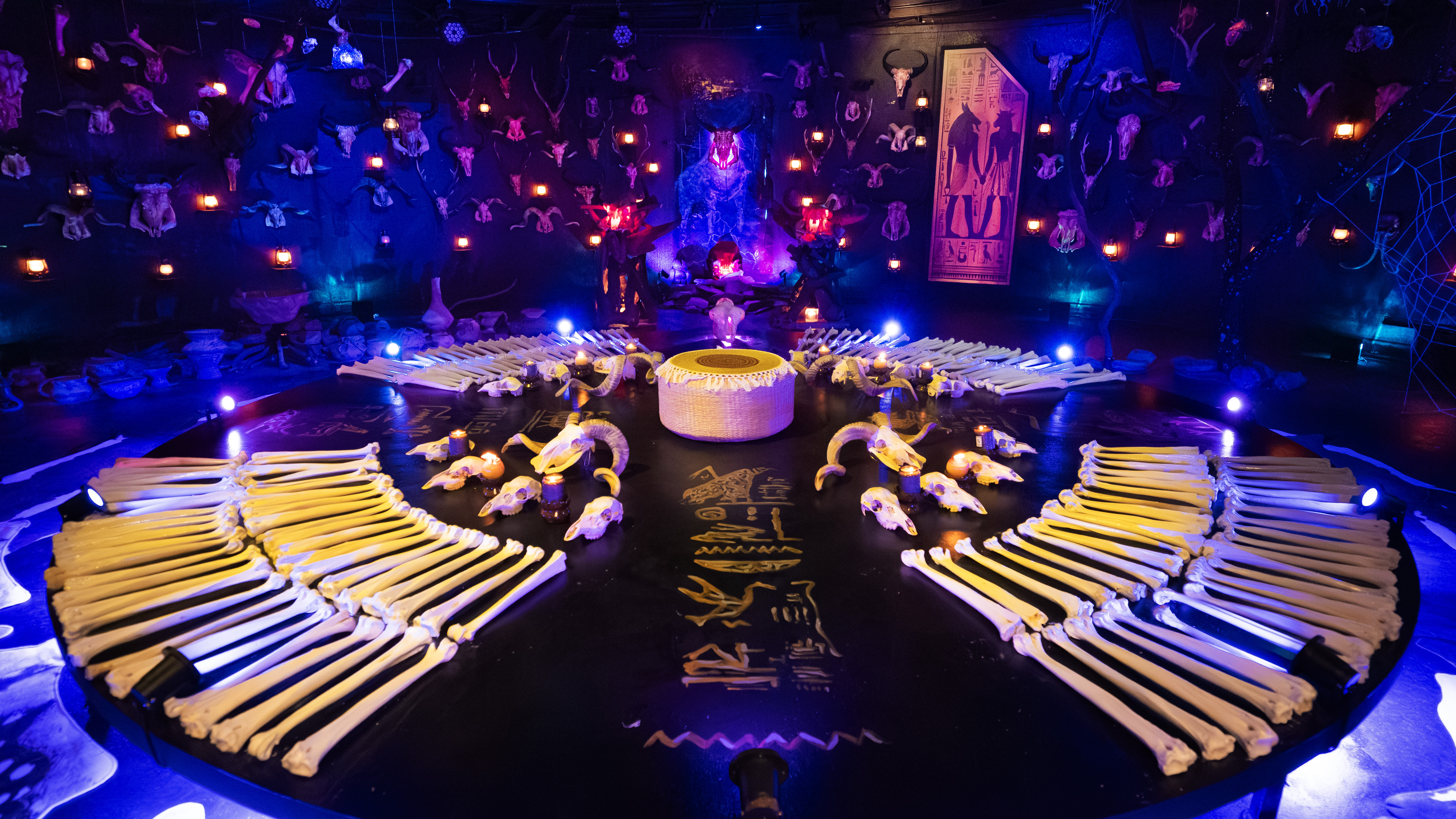 這座以「死亡與重生」為主題的沉浸式藝術裝置,由十鼓藝術團隊策劃一年打造,融合古埃及祭祀意象與遠古翼龍獸骨共創,呈現出一個介於神祕與莊嚴之間的奇幻聖域。祭壇中央由鴕鳥腿骨環繞、駱駝頭骨鎮守並象徵「沙漠之舟」的靈魂再生。四周環繞藍綠色鬼火、異火與石蠟油燈,伴以手工編織巨型蜘蛛網形成能量結界,而懸掛於空中的古埃及「翼龍骨架」則代表「天空之主」,守護並見證萬物的輪迴,以獸骨搭配埃及象形文字圖騰及公牛神~阿匹斯、公羊神庫努牡的形象為主軸,期待獸骨祭壇成為祈福及萬物重生的地方。整體以黑、白、金三色為主調,呈現古文明與現代藝術的完美融合。