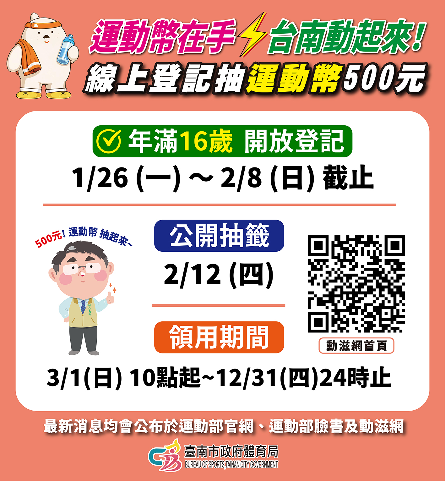 運動部115年推出「運動幣」,並採登記抽籤方式辦理。凡年滿16歲(民國99年1月1日前出生)且設籍國內之國民,均可於115年1月26日上午10時起至2月8日24時止完成登記,並將於115年2月12日辦理公開抽籤,有機會獲得500運動幣,歡迎市民把握機會踴躍參與。